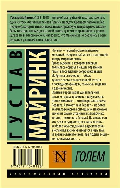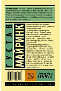 "Голем" — первый роман Майринка, имевший невероятный успех и принесший автору мировую славу.Произведение, в котором впервые появились образы и нашли отражение темы, впоследствии сопровождавшие Майринка всю жизнь, — образ лунного света и таинственной "стены у последнего фонаря", темы сна, видения и двойничества.Главный герой видит удивительный сон, в котором проживает целую жизнь своего двойника— антиквара Атанасиуса Перната. А может, сам Пернат— не более чем человеческое воплощение персонажа одной из самых странных и загадочных легенд — глиняного Голема? Да и важно ли это, если, в сущности, вся наша жизнь — не более чем сон длиной в десятилетия, а истинная жизнь начинается лишь там, за гранью лунного света, где люди и вещи — не то, чем кажутся…