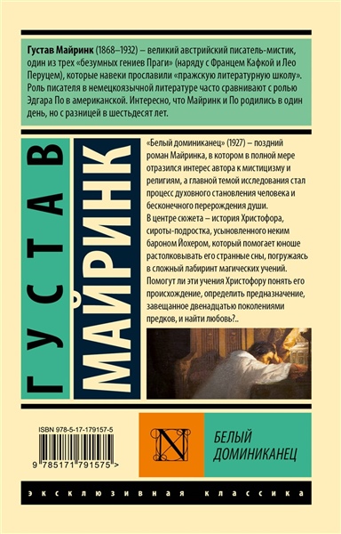 "Белый доминиканец" (1927) — поздний роман Майринка, в котором в полной мере отразился интерес автора к мистицизму и религиям, а главной темой исследования стал процесс духовного становления человека и бесконечного перерождения души. В центе сюжета — история Христофора, сироты-подростка, усыновленного неким бароном Йохером, который помогает юноше растолковывать его странные сны, погружаясь в сложный лабиринт магических учений. Помогут ли эти учения Христофору понять его происхождение, определить предназначение, завещанное двенадцатью поколениями предков, и найти любовь?..