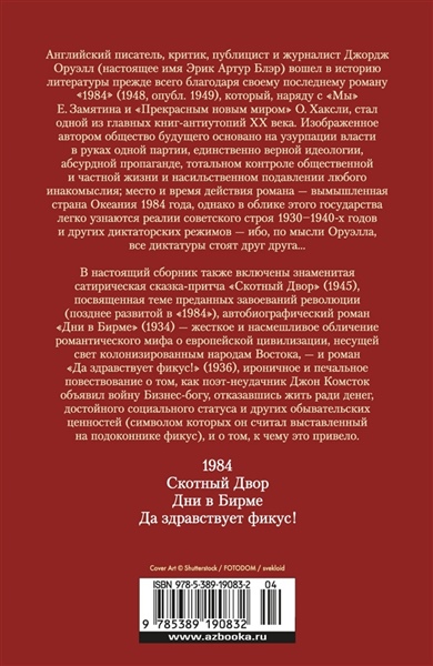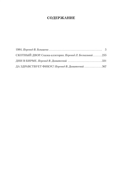 Английский писатель, критик, публицист и журналист Джордж Оруэлл (настоящее имя Эрик Артур Блэр) вошел в историю литературы прежде всего благодаря своему последнему роману «1984» (1948, опубл. 1949), который стал одной из главных книг-антиутопий ХХ века. Изображенное автором общество будущего основано на тотальной несвободе личности, пропаганде и открытом насилии – победивших, согласно горькому и грозному предсказанию автора, в вымышленном государстве Океания к 1984 году; однако в его облике легко узнаются реалии советского строя 1930-1940-х годов и других диктаторских режимов – ибо, по Оруэллу, все диктатуры стоят друг друга… В настоящий сборник также включены знаменитая сатирическая сказка-притча «Скотный Двор» (1945), посвященная теме преданных завоеваний революции (позднее развитой в «1984»), автобиографический роман «Дни в Бирме» (1934) – жесткое и насмешливое обличение романтического мифа о европейской цивилизации, несущей свет колонизированным народам Востока, – и роман «Да здравствует фикус!» (1936), ироничное и печальное повествование о том, как поэт-неудачник Джон Комсток объявил войну Бизнес-богу, отказавшись жить ради денег, достойного социального статуса и других обывательских ценностей (символом которых он считал выставленный на подоконнике фикус), – и о том, к чему это привело.