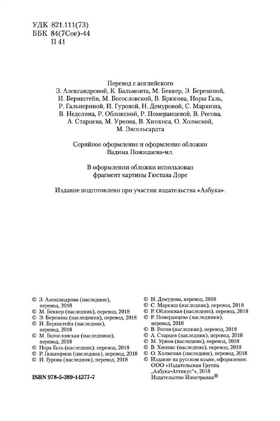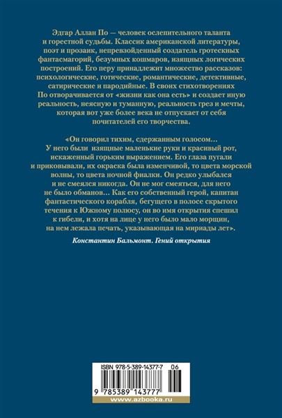 Эдгар Аллан По – человек ослепительного таланта и горестной судьбы. Классик американской литературы, поэт и прозаик, непревзойденный создатель гротескных фантасмагорий, безумных кошмаров, изящных логических построений. Его перу принадлежит множество рассказов: психологические, готические, романтические, детективные, сатирические и пародийные. В своих стихотворениях По отворачивается от «жизни как она есть» и создает иную реальность, неясную и туманную, реальность грез и мечты, которая вот уже более века не отпускает от себя почитателей его творчества.