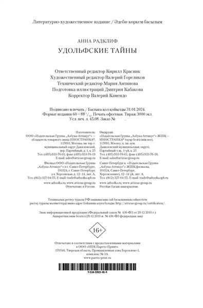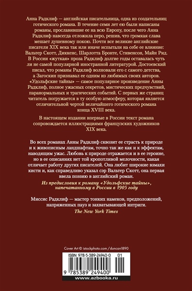 Анна Радклиф — английская писательница, одна из создательниц готического романа. В течение семи лет ею были написаны романы, прославившие ее на всю Европу, после чего Анна Радклиф навсегда отложила перо, решив, что громкая слава мешает душевному покою. Почти все великие английские писатели XIX века так или иначе испытали на себе ее влияние: Вальтер Скотт, Диккенс, Шарлотта Бронте, Стивенсон, Майн Рид. В России «жуткая» проза Радклиф долгие годы оставалась чуть ли не самой популярной иностранной литературой. Достоевский писал, что романы Радклиф волновали его с самого детства, а Загоскин признавал ее одним из любимых своих авторов. «Удольфские тайны» — самое популярное произведение Анны Радклиф, полное ужасных секретов, мистических предчувствий, паранормальных и трагических событий. С первых же страниц читатель погружается в ту особую атмосферу, которая является отличительной чертой величайшего готического романа конца XVIII века. В настоящем издании впервые в России текст романа сопровождается иллюстрациями французских художников XIX века.