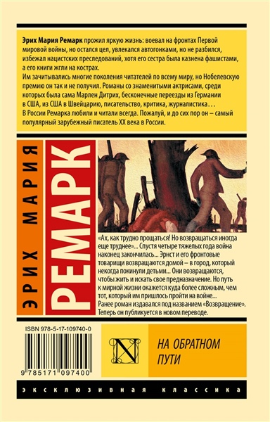 "Ах, как трудно прощаться! Но возвращаться иногда еще труднее"…Спустя четыре тяжелых года война наконец закончилась… Эрнст и его фронтовые товарищи возвращаются домой — в город, который некогда покинули еще детьми… Они возвращаются, чтобы жить и искать свое истинное предназначение. Но путь к мирной жизни окажется куда более сложным, чем тот, который им пришлось пройти на войне…Ранее роман издавался под названием "Возвращение". Теперь он публикуется в новом переводе.