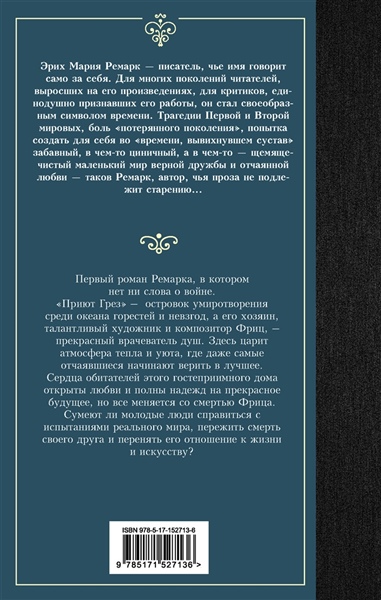 Первый роман Ремарка, в котором нет ни слова о войне. "Приют Грез" –островок умиротворения среди океана горестей и невзгод, а его хозяин, талантливый художник и композитор Фриц, – прекрасный врачеватель душ. Здесь царит атмосфера тепла и уюта, где даже самые отчаявшиеся начинают верить в лучшее. Сердца обитателей этого гостеприимного дома открыты любви и полны надежд на прекрасное будущее, но все меняется со смертью Фрица. Сумеют ли молодые люди справиться с испытаниями реального мира, пережить смерть своего друга и перенять его отношение к жизни и искусству? Роман публикуется в новом переводе.