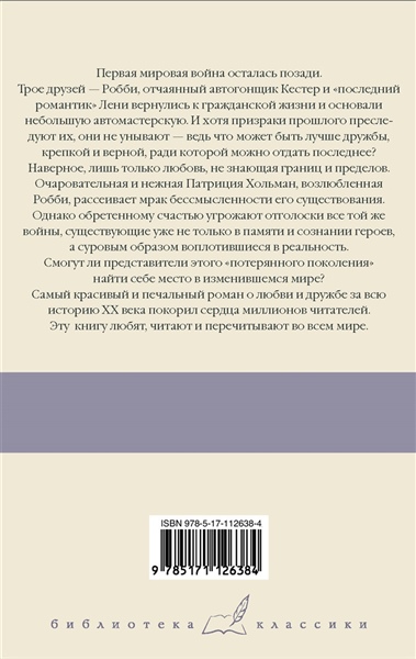 Первая мировая война осталась позади. Трое друзейРобби, отчаянный автогонщик Кестер и последний романтик Лени вернулись к гражданской жизни и основали небольшую автомастерскую. И хотя призраки прошлого преследуют их, они не унываютведь что может быть лучше дружбы, крепкой и верной, ради которой можно отдать последнее? Наверное, лишь только любовь, не знающая границ и пределов. Очаровательная и нежная Патриция Хольман, возлюбленная Робби, рассеивает мрак бессмысленности его существования. Однако обретенному счастью угрожают отголоски все той же войнысуществующие уже не только в памяти и сознании героев, а суровым образом воплотившиеся в реальность. Смогут ли представители этого потерянного поколения найти себе место в изменившемся мире?Самый красивый и печальный роман о любви и дружбе за всю историю ХХ века покорил сердца миллионов читателей. Эту книгу любят, читают и перечитывают во всем мире.