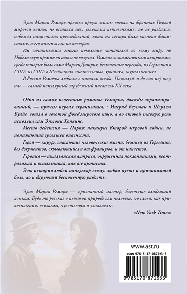 Один из самых известных романов Ремарка, дважды экранизированный,причем первая экранизация, с Ингрид Бергман и Шарлем Буайе, вошла в золотой фонд мирового кино, а во второй главную роль исполнил сам Энтони Хопкинс.Место действияПариж накануне Второй мировой войны, не понимающий грозящей опасности.Геройхирург, спасающий человеческие жизни, беженец из Германии, без документов, скрывающийся и от французов, и от нацистов.Героиняитальянская актриса, окруженная поклонниками, неотразимая и вспыльчивая, как все артисты.Это история любви наперекор всему, любви, пусть и причиняющей боль, но и дарующей бесконечную радость.