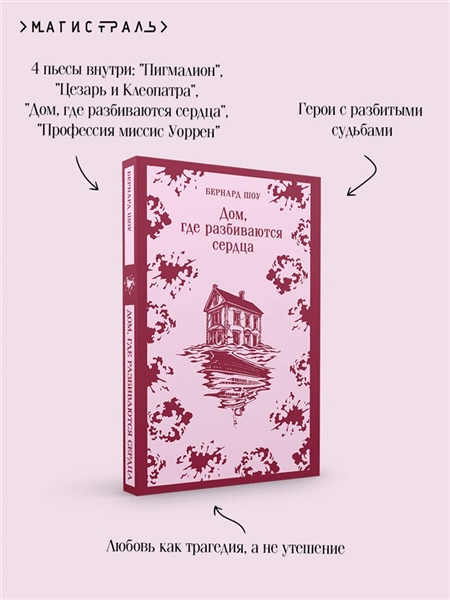 В данный сборник вошли пьесы 4 пьесы Бернарда Шоу: «Пигмалион», «Цезарь и Клеопатра», «Дом, где разбиваются сердца», «Профессия миссис Уоррен» ставшие классикой театральных сцен всего мира. Входит в университетскую программу многих гуманитарных направлений. Шоу остро поднимает проблемы духовного кризиса и лицемерия в обществе в «Дом, где разбиваются сердца»; вопросов нравственности, женской независимости и социальной несправедливости в «Профессия миссис Уоррен»; классового неравенства и социальных предрассудков в «Пигмалионе»; власти и нравственного роста личности через историческую призму в «Цезарь и Клеопатра». В каждой пьесе автор через острый юмор и парадоксы побуждает к переосмыслению установок и поиску подлинных человеческих ценностей.