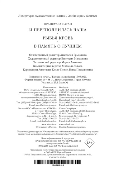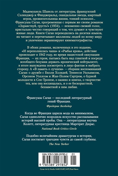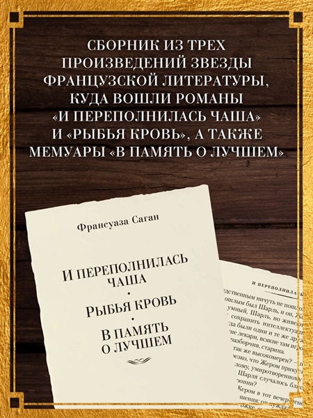 В своих книгах Саган, чутко настроенная на тонкие вибрации каждого дня, который она проживала, обращалась к историческим событиям нечасто. Однако в обоих романах, включенных в это издание, «И переполнилась чаша» и «Рыбья кровь», действие происходит в 1942 году, во время нацистской оккупации Франции, — их герои, пытаясь быть над схваткой и посреди всеобщего безумия держать иронический нейтралитет, в итоге вынуждены посмотреть в лицо фактам и выбрать сторону. А «В память о лучшем» — сборник воспоминаний Саган: о дружбе с Билли Холидей, Теннесси Уильямсом, Орсоном Уэллсом и Жан-Полем Сартром, о бурной молодости в Сен-Тропезе, о казино и книгах, о творчестве тех, кем она восхищалась, и о ее бескорыстной, беззаветной к ним любви.