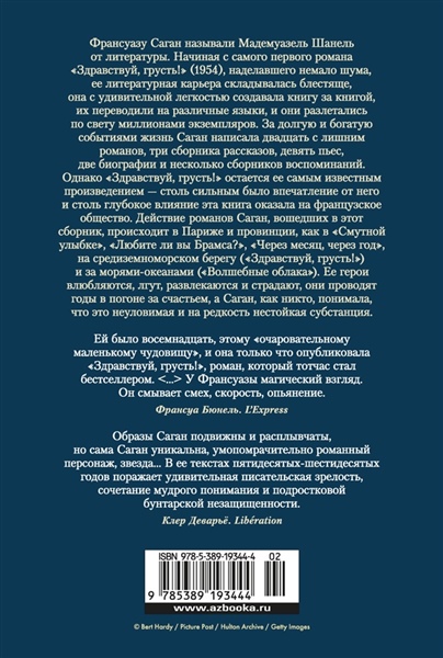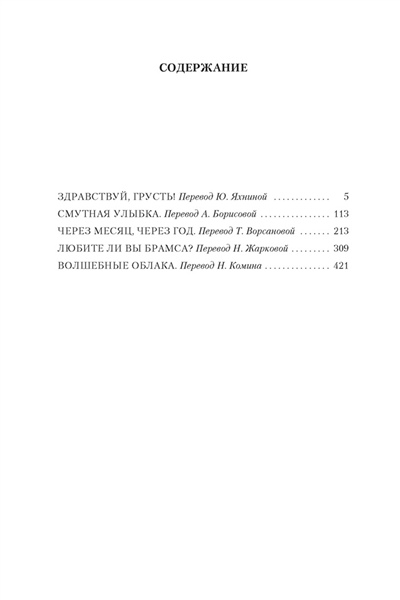 Франсуазу Саган называли Мадемуазель Шанель от литературы. Начиная с самого первого романа «Здравствуй, грусть!» (1954), наделавшего немало шума, ее литературная карьера складывалась блестяще, она с удивительной легкостью создавала книгу за книгой, их переводили на различные языки и они разлетались по свету миллионами экземпляров. За долгую и богатую событиями жизнь Саган написала двадцать с лишнимроманов, три сборника рассказов, девять пьес, две биографии и несколько сборников воспоминаний. Однако «Здравствуй, грусть!» остается ее самым известным произведением — столь сильным было впечатление от него и столь глубокое влияние эта книга оказала на французское общество. Действиероманов Саган, вошедших в этот сборник,происходит в Париже и провинции, как в «Смутной улыбке», «Любите ли вы Брамса?», «Через месяц, через год», на средиземноморском берегу («Здравствуй, грусть!») и за моря-океанами («Волшебные облака»). Ее герои влюбляются, лгут, развлекаются и страдают, они проводят годы в погоне за счастьем, а Саган, как никто, понимала, что это неуловимая и на редкость нестойкая субстанция.
