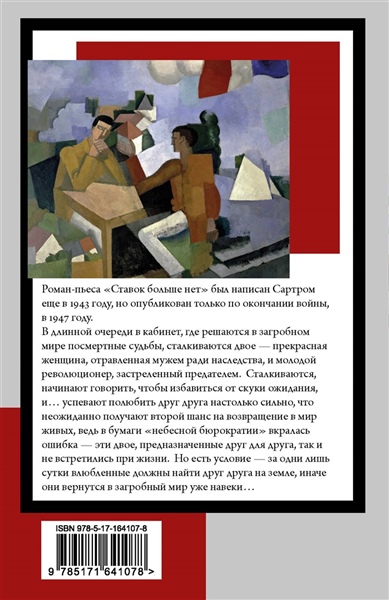 Роман-пьеса "Ставок больше нет" был написан Сартром еще в 1943 году, но опубликован только по окончании войны, в 1947 году. В длинной очереди в кабинет, где решаются в загробном мире посмертные судьбы, сталкиваются двое – прекрасная женщина, отравленная мужем ради наследства, и молодой революционер, застреленный предателем.Сталкиваются, начинают говорить, чтобы избавиться от скуки ожидания, и… успевают полюбить друг друга настолько сильно, что неожиданно получают второй шанс на возвращение в мир живых, ведь в бумаги "небесной бюрократии" вкралась ошибка – эти двое, предназначенные друг для друга, так и не встретились при жизни. Но есть условие – за одни лишь сутки влюбленные должны найти друг друга на земле, иначе они вернутся в загробный мир уже навеки…