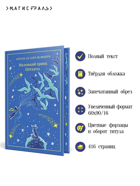 Летчик, потерпевший крушение в пустыне Сахара, встречает странного мальчика — Маленького принца. Тот прибыл с астероида B-612, где жил один, заботясь о красивой, но капризной Розе. В своенравной Розе угадывается образ жены писателя, Консуэло, с которой у них были страстные и сложные отношения. Сказка-притча «Маленький принц» издается с авторскими иллюстрациями.