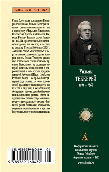 Среди блестящих романистов Викторианской эпохи Уильям Теккерей занимает самое почетное место и стоит в одном ряду с Чарльзом Диккенсом, Шарлоттой Бронте и Элизабет Гаскелл. Роман «Записки Барри Линдона» (1844), представленный в настоящем издании, лег в основу известного фильма Стэнли Кубрика (2004), «одной из самых многогранных и выразительных костюмных драм в истории кино». Роман Теккерея увидел свет незадолго до его знаменитой «Ярмарки Тщеславия», на страницах которой читатель познакомился с очаровательной и невероятно предприимчивой Ребеккой Шарп. Пройдоха Редмонд Барри — ее прямой литературный родственник. История похождений ирландского авантюриста, его взлетов и падений, в которой автор обыгрывает каноны семейной хроники и плутовского романа, имела неоднозначные отзывы современников, но спустя несколько лет после публикации роман был назван «сказочным подвигом чистой иронии» и признан безусловным достижением писателя. «Его гениальный дар покорен его воле, как слуга, которому не дозволяется, поддавшись буйному порыву, бросаться в фантастические крайности, он должен добиваться цели, поставленной ему и чувством, и рассудком. Теккерей неповторим. Большего я не могу сказать, меньше сказать не желаю» (Шарлотта Бронте).