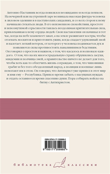 Антонио Наставник всегда появлялся неожиданно и всегда пешком. На вечерней или на утренней заре возникала высокая фигура человека в лиловом одеянии и в пастушеских сандалиях, и со всех сторон к нему начинали стекаться люди. В его неизменном спокойствии, простоте и невозмутимой серьезности таилась неодолимая притягательная сила, привлекавшая к нему сердца людей. Свои наставления он начинал в тот час, когда на небе пламенеет закат, а на земле разжигают костры, чтобы отогнать москитов и приготовить ужин, когда спадает удушливый зной и налетает легкий ветерок, от которого у человека поднимается дух и появляются силы противостоять навалившимся бедствиям.Он говорил о простом и важном, о том, что касалось и волновало каждого.О том, что на их многострадальную страну обрушились засухи, эпидемии и полчища змей, а правительство ничего не делает для того, чтобы хоть как-то облегчить жизнь сограждан, о том, что чиновники грабят и без того обездоленный народ, а полиция и военные лишь помогают им в этом. Он говорил, что Антихрист уже пришел в этот мир; и имя ему – Республика. Пришло время забыть о насущных нуждах и отдать оставшееся время спасению души. Пора собирать войско на битву с Антихристом.