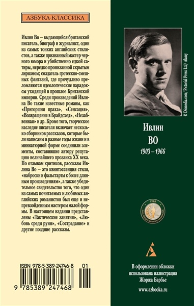Ивлин Во (1903–1966) — выдающийся британский писатель, биограф и журналист, один из самых тонких английских стилистов, а также признанный мастер черного юмора и убийственно едкой сатиры, нередко пронизанной скрытым лиризмом; создатель гротескно-смешных фантазий, где причудливо преломляются идеологические парадоксы уходящей в прошлое Британской империи. Среди произведений Ивлина Во такие известные романы, как «Пригоршня праха», «Сенсация», «Возвращение в Брайдсхед», «Незабвенная» и др. Кроме того, творческое наследие писателя включает несколько сборников рассказов, которые были написаны в разные годы жизни и в миниатюрной форме соединили элементы, составившие автору репутацию величайшего прозаика ХХ века. По отзывам критиков, рассказы Ивлина Во — это квинтэссенция стиля, «наброски и фальстарты к более длинным произведениям», а также убедительное свидетельство того, что один из самых почитаемых и любимых английских романистов был еще и непревзойденным мастером малой формы. В настоящем издании представлены «Тактические занятия», «Любовь среди руин», «Сострадание» и другие поздниерассказы.
