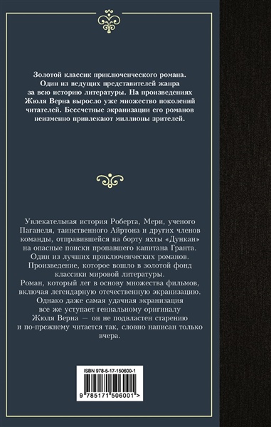 Увлекательная история Роберта, Мери, ученого Паганеля, танственного Айртона и других членов команды, отправившейся на борту яхты "Дункан" на опасные поиски пропавшего капитана Гранта. Один из лучших приключенческих романов. Произведение, которое вошло в золотой фонд классики мировой литературы. Роман, который лег в основу множества фильмов, включая легендарную отечественную экранизацию. Однако даже самая удачная экранизация все же уступает гениальному оригиналу Жюля Верна – он не подвластен старению и по-прежнему читается так, словно написан только вчера.