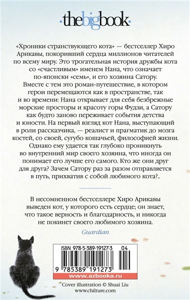«Хроники странствующего кота» – бестселлер Хиро Арикавы, покоривший сердца миллионов читателей по всему миру. Это трогательная история дружбы кота со «счастливым» именем Нана, что означает по-японски «семь», и его хозяина Сатору. Вместе с тем это роман-путешествие, в котором герои перемещаются как в пространстве, так и во времени: Нана открывает для себя безбрежные морские просторы и красоту горы Фудзи, а Сатору как будто заново переживает события детства и юности. На первый взгляд, кот Нана, выступающий в роли рассказчика, - реалист и прагматик до мозга костей, со своей, сугубо кошачьей, философией жизни. Однако ему удается так глубоко проникнуть во внутренний мир своего хозяина, что иногда он понимает его лучше него самого. Кто же они друг для друга? Зачем Сатору раз за разом отправляется в путь, прихватив с собой любимого кота?..