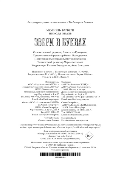 О чем говорят звери, когда люди не слышат? Какой мир создадут звери, когда люди исчезнут вовсе? Бестиарий французского художника, графика, дизайнера и карикатуриста Николя Виаля явился из детства — из унаследованной от деда и отца любви к типографике и юношеского увлечения анималистикой. История, написанная Мюриель Барбери, автором международного бестселлера «Элегантность ежика», родилась из нашей повседневности, которую люди проживают, не приходя в сознание. Звери смотрят на нас очень внимательно — но мы не замечаем. Звери говорят о нас — но мы не понимаем. Возможно, звери останутся и после нас — но мы не умеем вообразить такой мир. А Мюриель Барбери умеет. Это опасный, смешной и по-прежнему очень сложный мир, в котором люди почему-то исчезли, а звери пишут свою историю сами. Перед вами изумительный плод сотрудничества одного из самых умных и глубоких писателей современности с одним из самых самобытных художников. Артбук «Звери в буквах» — «Алиса в Стране чудес» пополам с Платоном, «Обитатели холмов», начитавшиеся Лафонтена, лаконичная сказка, глубокая притча и выставка, куда заглядываешь случайно и мимоходом, а потом полдня не находишь в себе сил уйти и советуешь ее всем друзьям и знакомым. Нам вслед устремлены глаза, которые пристально наблюдают каждый день. После нашего исчезновения звучат голоса, которые мы привыкли не замечать. Впервые на русском!