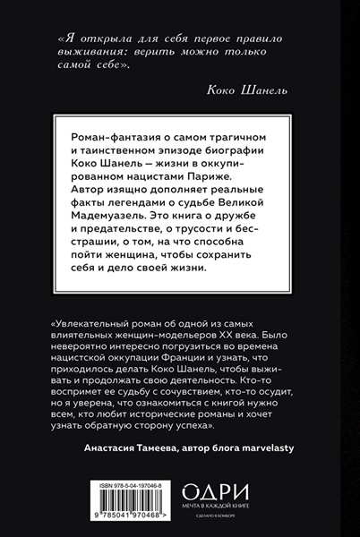 Роман-фантазия о самом трагичном и таинственном эпизоде в биографии Коко Шанель — жизни в оккупированном нацистами Париже. Автор изящно дополняет реальные факты легендами о судьбе Великой Мадемуазель. Это книга о дружбе и предательстве, о трусости и бесстрашии, о том, на что способна пойти женщина, чтобы сохранить себя и дело своей жизни.