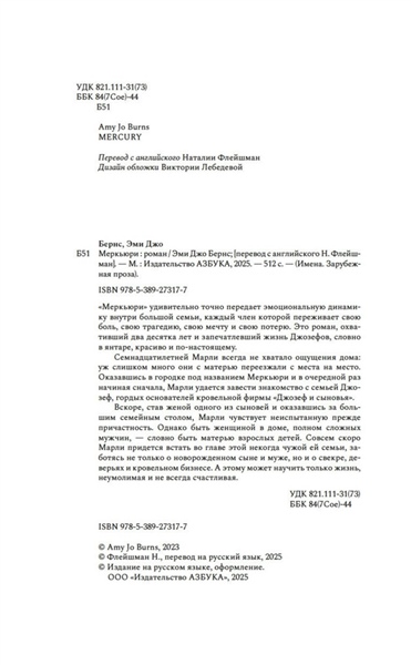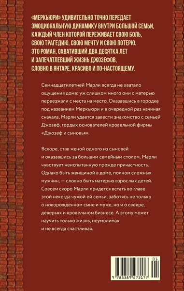 «Меркьюри» удивительно точно передает эмоциональную динамику внутри большой семьи, каждый член которой переживает свою боль, свою трагедию, свою мечту и свою потерю. Это роман, охвативший два десятка лет и запечатлевший жизнь Джозефов, словно в янтаре, красиво и по-настоящему. Семнадцатилетней Марли всегда не хватало ощущения дома: уж слишком много они с матерью переезжали с места на место. Оказавшись в городке под названием Меркьюри и в очередной раз начиная с начала, Марли удается завести знакомство с семьей Джозефов, гордых основателей кровельной фирмы «Джозеф и сыновья». Вскоре, став женой одного из сыновей и оказавшись за большим семейным столом, Марли чувствует неиспытанную прежде причастность. Однако быть женщиной в доме, полном сложных мужчин, – словно быть матерью взрослых детей. Совсем скоро Марли придется встать во главе этой некогда чужой ей семьи, заботясь не только о новорожденном сыне и муже, но и о свекре, деверьях и кровельном бизнесе. А этому может научить только жизнь, неумолимая и не всегда счастливая.