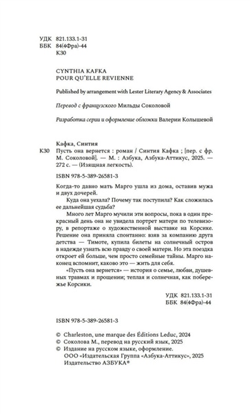 Когда-то давно мать Марго мать ушла из дома, оставив мужа и двух дочерей. Куда она уехала? Почему так поступила? Как сложилась ее дальнейшая судьба? Много лет Марго мучили эти вопросы, пока в один прекрасный день она не увидела портрет матери по телевизору, в репортаже о художественной выставке на Корсике. Решение она приняла спонтанно: взяв за компанию друга детства, Тимоте, купила билеты на солнечный остров в надежде узнать всю правду о своей матери. Но эта поездка откроет ей больше, чем просто семейные тайны. Наконец Марго вспомнит, каково это: жить для себя. «Пусть она вернется» - история о семье, любви, душевных травмах и прощении; теплая и солнечная, как побережье Корсики.