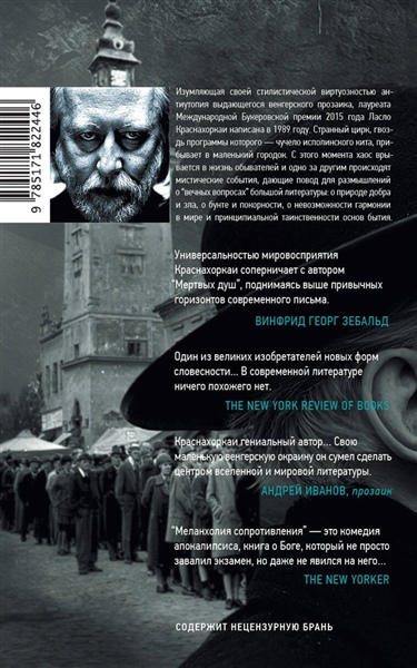 Изумляющая своей стилистической виртуозностью антиутопия выдающегося венгерского прозаика, лауреата Нобелевской премии по литературе (2025) Ласло Краснахоркаи написана в 1989 году. Странный цирк, гвоздь программы которого — чучело исполинского кита, прибывает в маленький городок. С этого момента хаос врывается в жизнь обывателей и одно за другим происходят мистические события, дающие повод для размышлений о “вечных вопросах” большой литературы: о природе добра и зла, о бунте и покорности, о невозможности гармонии в мире и принципиальной таинственности основ бытия. Роман переведен на 16 языков. В 2000 году знаменитый мастер авторского кино Бела Тарр снял по нему фильм “Гармонии Веркмейстера”, который вошел в список 100 лучших художественных фильмов XXI века по версии ВВС.