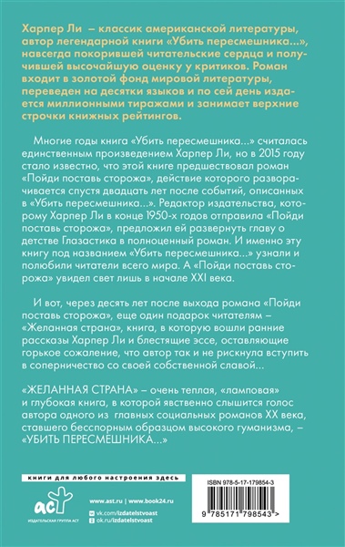 Харпер Ли (1926–2016) — классик американской литературы, автор легендарной книги "Убить пересмешника...", навсегда покорившей читательские сердца. Роман входит в золотой фонд мировой литературы, переведен на десятки языков и по сей день издается миллионными тиражами и занимает верхние строчки книжных рейтингов. Многиегоды одна из величайших книг минувшего столетия – "Убить пересмешника…" – считалась единственным произведением Харпер Ли. Однако в июле 2015 года литературный мир потрясла новость о выходе продолжения "Пересмешника". И вот, спустя десять лет, еще один подарок читателям – "Желанная страна", книга, в которую вошли ранние рассказы Харпер Ли и блестящие эссе, оставляющие горькое сожаление, что автор так и не рискнула вступить в соперничество со своей собственной славой…