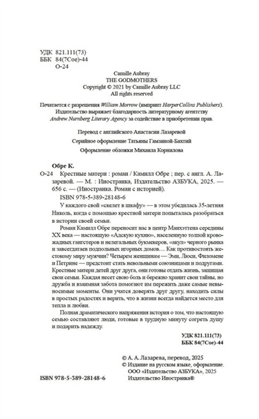 Роман Камилл Обре переносит нас в центр Манхэттена середины XX века — настоящую «Адскую кухню», населенную толпой кровожадных гангстеров и нелегальных букмекеров, «акул» черного рынка и завсегдатаев подпольных игорных домов… Как противостоять жестокому миру мужчин? Четырем женщинам — Эми, Люси, Филомене и Петрине — предстоит стать невольными союзницами и подругами. Крестные матери детей друг друга, они готовы отдать жизнь, защищая свои семьи. Каждая несет свою боль и бережно хранит свои тайны, но дружба и взаимная забота помогают им пережить даже самые невыносимые моменты. Они учатся доверять друг другу, находить силы в простых радостях и верить, что в жизни всегда найдется место для тепла и любви.