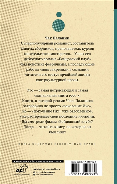 Это — самая потрясающая и самая скандальная книга 1990-х. Книга, в которой устами Чака Паланика заговорило не просто "Поколение Икс", но — "поколение Икс" уже озлобленное, уже растерявшее свои последние иллюзии. Вы смотрели фильм "Бойцовский клуб"? Тогда — читайте книгу, по которой он был снят!