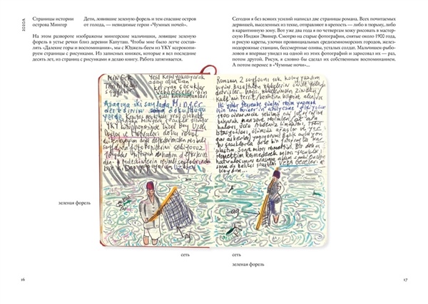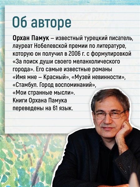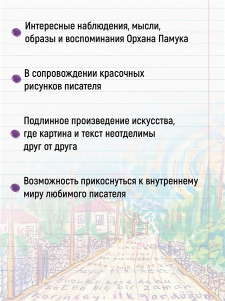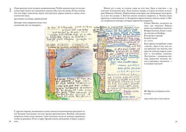 Записные книжки Орхана Памука не только позволяют прикоснуться к внутреннему миру любимого писателя, но и являются подлинным произведением искусства, где рисунок и текст неотделимы друг от друга, как неотделимы человек и его воспоминания.