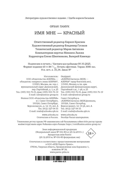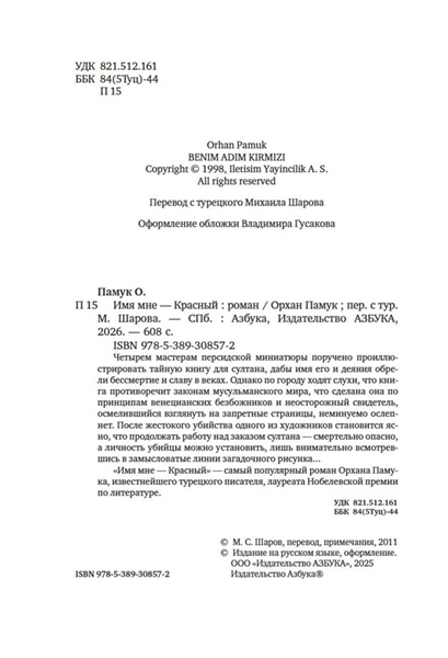 «Имя мне — Красный» — самый популярный роман Орхана Памука, известнейшего турецкого писателя, лауреата Нобелевской премии по литературе.