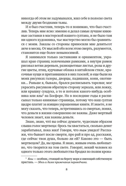 Четырем мастерам персидской миниатюры поручено проиллюстрировать тайную книгу для султана, дабы имя его и деяния обрели бессмертие и славу в веках. Однако по городу ходят слухи, что книга противоречит законам мусульманского мира, что сделана она по принципам венецианских безбожников и неосторожный свидетель, осмелившийся взглянуть на запретные страницы, неминуемо ослепнет. После жестокого убийства одного из художников становится ясно, что продолжать работу над заказом султана — смертельно опасно, а личность убийцы можно установить, лишь внимательно всмотревшись в замысловатые линии загадочного рисунка...