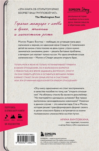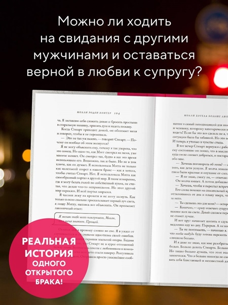 «Эта книга об открытом браке взорвет ваш групповой чат». — The Washington Post Горячие мемуары о любви и браке, желании и личностном росте. Молли Роден Винтер — любящая, но уставшая мама двух мальчиков и верная, но одинокая жена Стюарта. С появлением детей ее жизнь стала похожа на день сурка: утром нужно заниматься сыновьями, днем — решать бытовые проблемы, а вечером сил хватает только на сон. Но одна семейная ссора изменила все — Молли и Стюарт решили открыть брак. Теперь муж и жена не только устанавливают правила в своих отношениях, но и болезненно борются с ревностью, все время задаваясь вопросом: смогут ли они любить других и оставаться верными любви в браке? Станет ли их семья крепче и счастливее или эта отчаянная идея кончится крахом отношений? «Эту книгу однозначно не стоит воспринимать в качестве пособия по тому, как "открыть отношения". На обложку стоило бы вынести дисклеймер: "Не повторяйте в домашних условиях! Все трюки выполнены самонадеянными новичками!" Новички в данном случае — это женатая пара, Стю и Молли, которая решает трансформировать формат своего в целом классного брака и встречается со всеми положенными сложностями на этом пути». — Арина Винтовкина, секс-терапевт, психолог и автор блога «Это нормально»