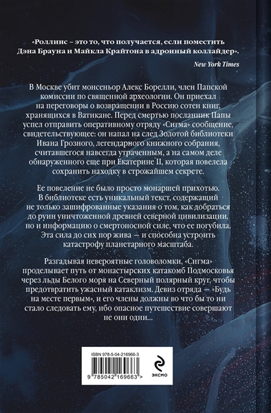 БЕСТСЕЛЛЕР NEW YORK TIMES. ПРОДОЛЖЕНИЕ КУЛЬТОВОЙ СЕРИИ ОБ ОТРЯДЕ «СИГМА». В Москве убит монсеньор Алекс Борелли, член Папской комиссии по священной археологии. Он приехал на переговоры о возвращении в Россию сотен книг, хранящихся в Ватикане. Перед смертью посланник папы успел отправить оперативному отряду «Сигма» сообщение, свидетельствующее — он напал на след Золотой библиотеки Ивана Грозного, легендарного книжного собрания, считавшегося навсегда утраченным, а на самом деле обнаруженным еще при Екатерине II, которая повелела сохранить находку в строжайшем секрете. Ее повеление не было просто монаршей прихотью. В библиотеке есть уникальный текст, содержащий не только зашифрованные указания о том, как добраться до руин уничтоженной древней северной цивилизации, но и информацию о смертоносной силе, что ее погубила. Эта сила до сих пор жива — и способна устроить катастрофу планетарного масштаба. Разгадывая невероятные головоломки, «Сигма» проделывает путь от монастырских катакомб Подмосковья через льды Белого моря на Северный полярный круг, чтобы предотвратить ужасный катаклизм. Девиз отряда — «Будь на месте первым», и его члены должны во что бы то ни стало следовать ему, ибо опасное путешествие совершают не они одни… Джеймс Роллинс — самый продаваемый автор приключенческих триллеров, создатель многочисленных бестселлеров № 1 по версии «New York Times», разошедшихся по всему миру тиражом 20 миллионов экземпляров и переведенных на 40 языков. _________________________________________________________________ «Роллинс — это то, что получается, если поместить Дэна Брауна и Майкла Крайтона в адронный коллайдер». — New York Times «Роллинс — безусловный лидер в том жанре художественной литературы, где сюжет строится на современном научном поиске тайных истин в останках погибших цивилизаций». — Wall Street Journal «Такие романы никто не пишет лучше Роллинса». — Ли Чайлд