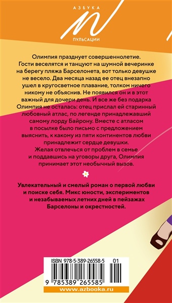 Олимпия празднует совершеннолетие, но полностью отдаться веселью она не может. Уже прошло два месяца с тех пор, как отец девушки ушел в кругосветное плавание, толком ничего никому не объяснив. Не появился он и в столь важный для нее день. И все же без подарка Олимпия не осталась: отец прислал ей старинный любовный атлас, по легенде принадлежавший самому лорду Байрону. Вместе с атласом в посылке было письмо с предложением выяснить, к какому из пяти континентов любви принадлежит сердце девушки. Поддавшись на уговоры лучшего друга, Олимпия решает принять этот необычный вызов.