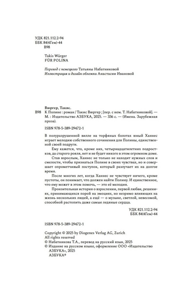 В полуразрушенной вилле на торфяных болотах юный Ханнес играет мелодию собственного сочинения для Полины, единственной своей подруги. Ему кажется, что кроме них, четырнадцатилетних подростков, да старого рояля, нет и не будет никого в этом огромном доме. Став взрослым, Ханнес не только не находит нужных слов и смелости, чтобы признаться Полине в своих чувствах, но и совершает опрометчивый поступок, который разлучает их на долгое время. После многих лет, когда Ханнес не чувствует ничего, кроме пустоты, он понимает, что должен найти Полину. И единственное, что ему может в этом помочь — это ее мелодия. Пронзительная история о взрослении, первой любви, решениях, принимающихся порой на эмоциях, но незримо влияющих на жизнь нескольких людей, а еще — о музыке, светлой, невесомой, способной растопить даже самые ледяные сердца.