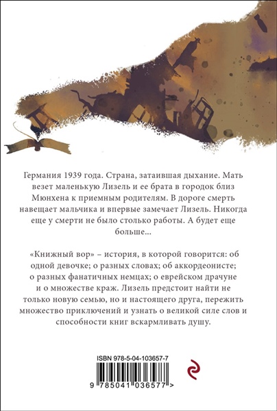 Январь 1939 года. Германия. Страна, затаившая дыхание. Никогда еще у смерти не было столько работы. А будет еще больше. Мать везет девятилетнюю Лизель Мемингер и ее младшего брата к приемным родителям под Мюнхен, потому что их отца больше нет — его унесло дыханием чужого и странного слова "коммунист", и в глазах матери девочка видит страх перед такой же судьбой. В дороге смерть навещает мальчика и впервые замечает Лизель. Так девочка оказывается на Химмель-штрассе — Небесной улице. Кто бы ни придумал это название, у него имелось здоровое чувство юмора. Не то чтобы там была сущая преисподняя. Нет. Но и никак не рай. "Книжный вор" — недлинная история, в которой, среди прочего, говорится: об одной девочке; о разных словах; об аккордеонисте; о разных фанатичных немцах; о еврейском драчуне; и о множестве краж. Это книга о силе слов и способности книг вскармливать душу.