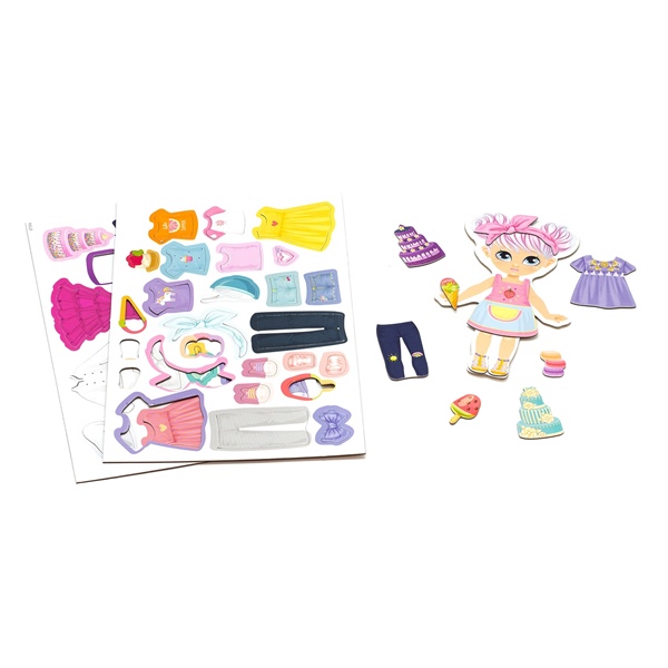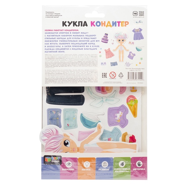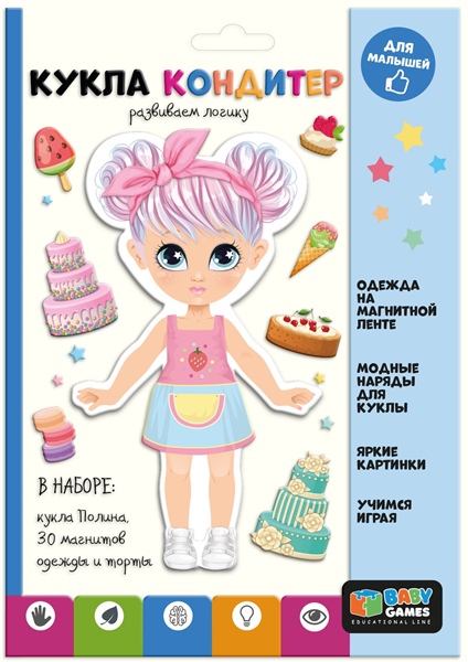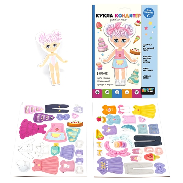 Полина работает кондитером, занимается спортом и любит моду! С магнитным набором малышка подберёт стильные наряды для куклы и придумает множество увлекательных сюжетов для игр. Выберите подходящий наряд и аксессуары, а затем приложите их к кукле. Одежда соединится с моделью благодаря магнитной ленте.