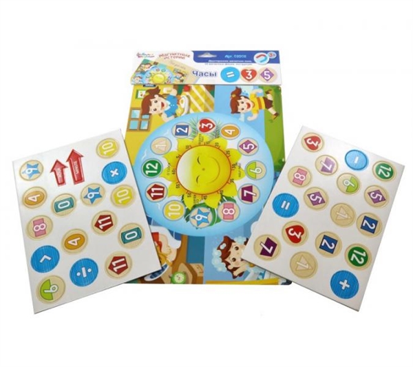 Развивающая магнитная игра «Часы» серии «Магнитные истории» для детей от 3-х лет. Игра имеет небольшой размер, благодаря чему, она идеальна для домашнего использования, в путешествии, а также в детских садах и центрах на общих развивающих занятиях и занятиях по подготовке к школе.