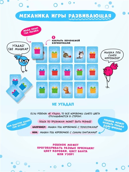 «Где мышка?» – карточная игра для самых маленьких. В одной коробке – две игры на развитие памяти и внимания, логики и речевых навыков. Задавайте вопросы правильно, открывайте по очереди цветные коробочки – и смотрите, кто притаился внутри. Попробуйте отыскать мышку среди котиков и найти все пары. Рекомендованный возраст: 3+