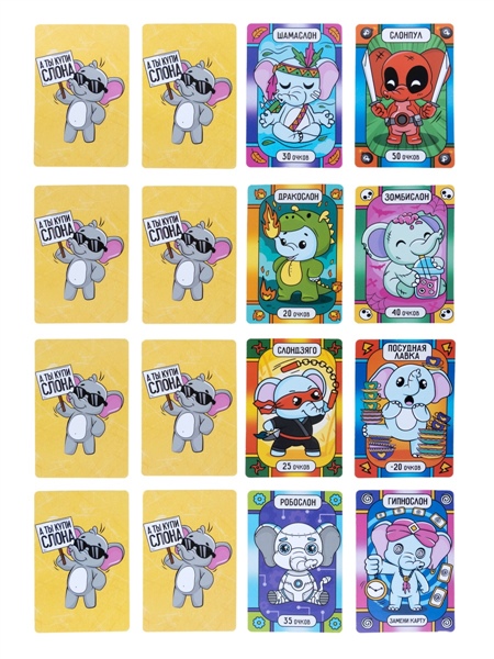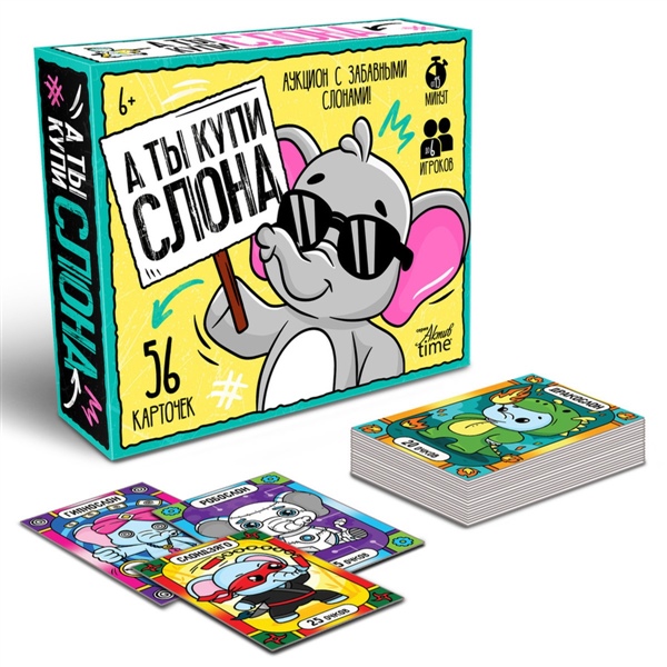Настольная игра «А ты купи Слона» - это не просто игра, это аукционное безумие, где каждый стремится первым собрать коллекцию из восьми очаровательных слонов одного вида и достичь заветных 250 очков. Готовьтесь к взрывным эмоциям, хитрым стратегиям и безудержному веселью! Состав игры: - карточки (8,4х5,5 см) - 56 шт. - правила игры Для детей от 6 лет Как играть? В каждом раунде вас ждет захватывающий аукцион, где в роли товара выступают уникальные слоны: слондзяго, шамаслон, робослон, слонпул, дракослон и зомбислон. Поднимите свои карты, объявите количество и начните торги! Обменивайтесь с другими игроками, ищите самые выгодные сделки, чтобы собрать полный комплект из восьми одинаковых слонов. Игра предполагает два режима: простой и усложненный. Новичкам подойдет упрощенный вариант, где можно сосредоточиться на основах аукциона и коллекционировании слонов. Для опытных игроков, жаждущих большего азарта, предусмотрен усложненный режим с использованием специальных карт "гипнослон" и "посудная лавка", которые добавляют в игру неожиданные повороты и дополнительные возможности. Аукцион продолжается до тех пор, пока один из игроков не соберет 8 одинаковых карточек. Затем торги закрываются, и все участники подсчитывают свои очки. Настольная игра "А ты купи слона"- это не просто развлечение, но и эффективный инструмент для развития ряда важных навыков. Она стимулирует креативное мышление и воображение. Способствует развитию коммуникативных навыков, учит гибкости мышления и способности находить выход из любой ситуации, даже самой неожиданной. Это идеальный выбор для тех, кто любит быстрые, динамичные и веселые настольные игры. Готовьтесь к аукциону, полному сюрпризов и слоновьих приключений!