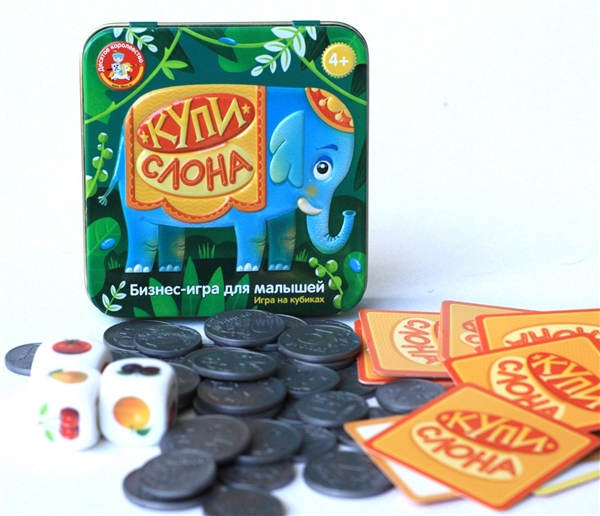 Учитесь считать до 20, вести денежные расчёты и выгодно продавать свои товары вместе с развивающей бизнес-игрой на кубиках для малышей «Купи слона»! Настольная игра в жестяной коробке «Купи слона» обучает навыкам устного счёта, тренирует память, внимание и сообразительность.