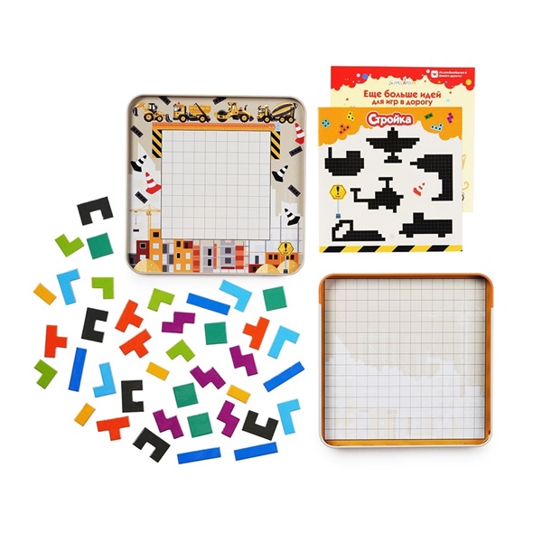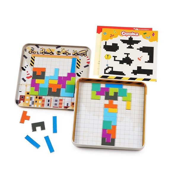 Игра "Стройка" рассчитана на 1-2 игрока. Сложите все строительные блоки в кучу и доставайте их по очереди. Первым выставляет свой блок младший игрок. Задача второго игрока - поставить свой блок так, чтобы одна из сторон касалась уже выставленного блока. Проигрывает тот, кто не сможет поставить свой блок на поле. Чтобы усложить игру, тяните блоки не глядя! Если игрок один, он может строить фигуры по инструкции из набора, это не всегда просто, но очень увлекательно! Фишки с магнитной основой надежно крепятся к металлической коробке, так что играть теперь можно где угодно!