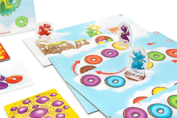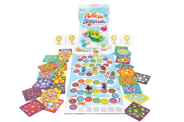 В стране летающих драконов очень любят пить чай! Каждый день после обеда дракончики летят к месту чаепития, стараясь обогнать своих друзей. Среди облаков есть настоящая дорожка из пончиков, а наши дракончики - такие сладкоежки, что тут и там останавливаются немного подкрепиться. Кто же из них быстрее всех долетит до места чаепития? "Летели дракончики" – это семейная игра-гонка, где вам предстоит привести к финишу несколько дракончиков по вашей карточке-заданию. Замедляйте или ускоряйте летающих дракончиков, подкармливая их любимыми лакомствами. Но помните: чем больше пончиков слопает дракончик, тем сильнее замедлится его полёт!