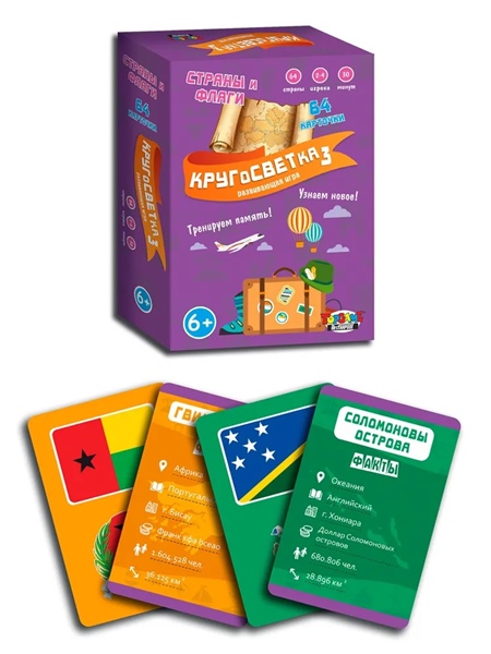 Это весёлая и познавательная игра для всех, кто хочет узнать что-то новое, проверить свою память и внимательность, и просто хорошо провести время в кругу друзей. Игра расширит кругозор, подарит новые знания и интерес к окружающему миру и путешествиям. Каждая карта содержит некоторые факты об определенной стране и соответствующий ей флаг. Задача игроков - запомнить как можно больше флагов и занимательных фактов и собрать наибольшее количество карточек.
