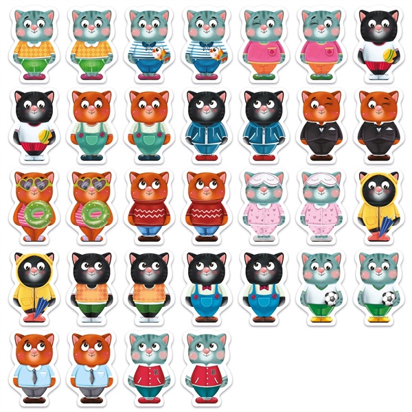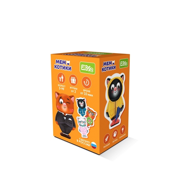 Карточки в виде знакомых силуэтов раскладываются на столе картинкой вниз, и котики-близнецы прячутся друг от друга. Задача игроков: как можно быстрее найти больше одинаковых котиков в кратчайшее время. За один ход каждый игрок открывает по две карточки. И теперь важно запомнить, кто и где спрятался. Веселое развлечение для маленькой и большой компании, для малышей и их родителей, для занятий в детском саду или в путешествии!