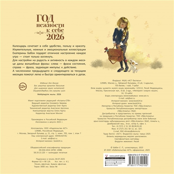 Календарь сочетает в себе удобство, пользу и красоту. Изумительные, нежные и эмоциональные иллюстрации Екатерины Бабок подарят отличное настроение каждое утро — стоит только взглянуть. Для настройки на радость и активность в каждом месяце даны волшебные фразы: слева — фраза состояния, справа — фраза, задающая импульс к действию. А численники предыдущего и следующего за текущим месяцев помогут легко и быстро ориентироваться в датах.