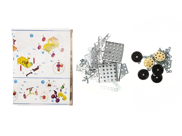С помощью этого набора Вы сможете создать 5 моделей начальной сложности - 2 машинки, кран, коляску и самолет.