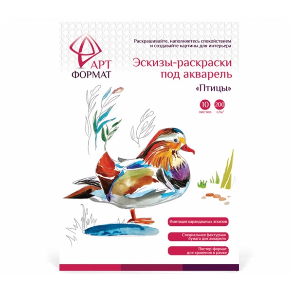 РАСКРАСКА-ЭСКИЗ ПОД АКВАРЕЛЬ 10Л А4 ПТИЦЫ АРТФОРМАТ /ПАПКА/ АРТ.AF13-043-07 (1284)