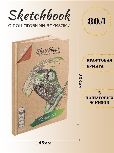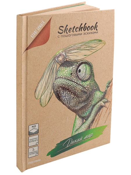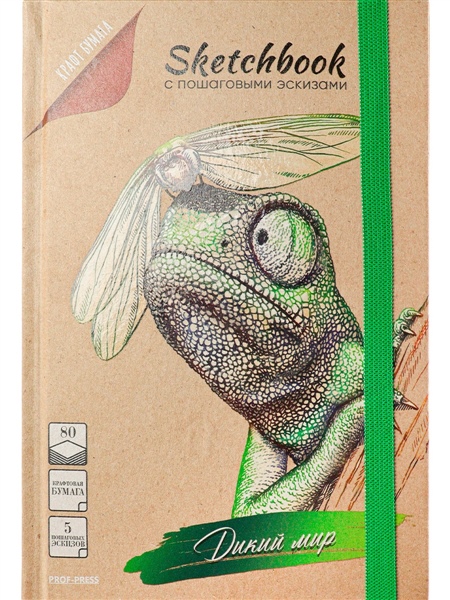 Представляем вашему вниманию новую серию уникальных скетчбуков с пошаговыми эскизами. На плотной бумаге эффектно и ярко смотрятся рисунки, выполненные гелевыми ручками, карандашами или пастельными мелками. Внутренний блок (80 листов) включает в себя 5 страниц рисунков животных дикого мира с пошаговыми эскизами. Они помогут вспомнить или научиться основным приёмам в процессе рисования. Скетчбук изготовлен из твёрдой обложки (7БЦ) с применением крафта с выборочным лаком. Такая обложка смотрится очень ярко и креативно, поверхность изделия приятна на ощупь и "играет" гладкой и шероховатой текстурами. Кроме того, благодаря твердой обложке удобно использовать скетчбук на весу. Небольшой формат (145×203 мм) удобен в использовании: легко помещается в сумку, комфортно брать с собой в кафе, парк, поездку и т.п. Листы внутреннего блока соединены методом клеевого бесшвейного крепления (КБС). Эластичная фиксирующая резинка способствует быстро найти необходимый лист, а также стильно дополняет дизайн самого скетчбука.