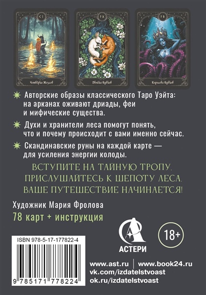 Авторская колода Таро, построенная как путешествие через темный лес. Каждая карта — это встреча с духом леса: старым Дубом, дарующим силу; хитрым Вороном, указывающим на обман; таинственной Дриадой, ведущей в царство трансформации. Еще одна особенность колоды — руны-обереги: они усиливают энергию Арканов и помогают глубже уловить смысл карт. Это Таро — не только для предсказаний, оно может стать вашим помощником: для защиты, духовного развития и гармонии. Колода поможет: • расшифровать знаки, которые посылает вам интуиция; • проторить тропу к вашей внутренней истине; • встретить помощников в виде рун, которые дадут силу справиться с преградами на пути. Комплект состоит из 78 карт, 8х12 см, и инструкции под размер коробки. Мара Гааг — писатель, автор книги "Созвездие чертополоха", практикующая ведьма, мантик с более чем двадцатилетним стажем работы с Таро, рунами и МАК. Колода также выходит под названием: "Таро Дух леса. Тропы, которые приведут к ответам".