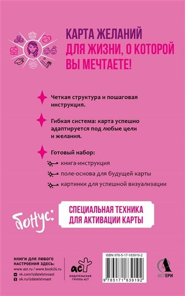 Карта желаний для женщин — готовый набор для визуализации будущего, о котором ты мечтаешь! Это не волшебная палочка, а осознанный метод работы с целями и желаниями. Этот набор с книгой-инструкцией научит правильно осознавать свои желания, формулировать их, визуализировать и, как результат, видеть пути их реализации. Техника карты желаний поможет сфокусировать позитивную энергию и привлечь в жизнь желанные перемены. Что внутри? • Полный комплект для создания карты желаний: книга-инструкция, поле-основа для будущей карты, картинки для успешной визуализации. • Пошаговый план действий: рекомендации, которые помогут шаг за шагом пройти путь от идеи до ее исполнения. • Инструкция для активации карты: способы, которые настроят энергетический поток на ускорение реализации желаний. • Гибкая система: карта успешно адаптируется под любые цели и желания. • Практические советы и тонкости: незаметные на первый взгляд нюансы, повышающие результативность и скорость достижения целей. Даже если ты никогда раньше не создавала карту желаний — не переживай! Это пошаговое руководство подробно объяснит, как сделать ее осознанно, точно и без ошибок. Дополнительные практики по активации карты, работе с лунными циклами и аффирмациями ускорят движение к успеху. Карта желаний не предсказывает будущее — она помогает его создавать. Начни жить так, как всегда мечтала! Книга выходила ранее под названием "Карта желаний: полный комплект с ритуалом активации".